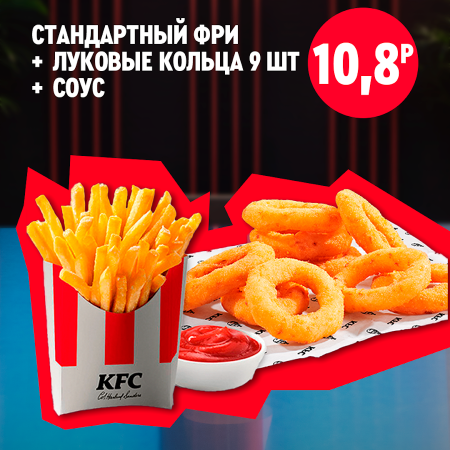 Картофель фри стандартной нарезки, луковые кольца и томатный соус