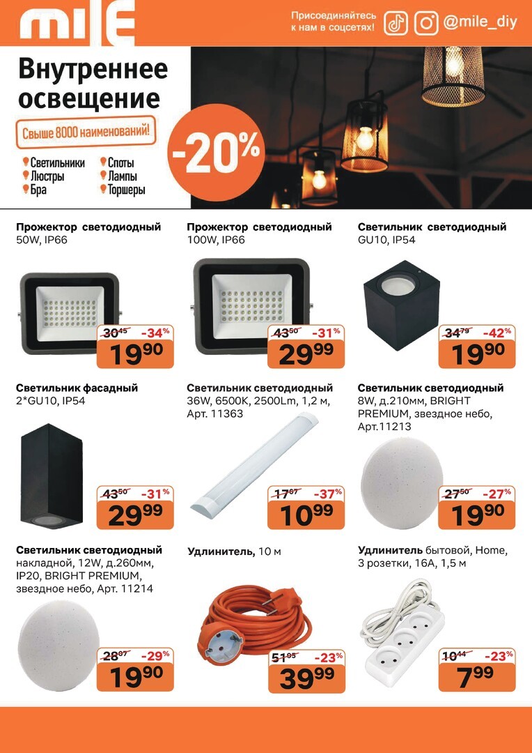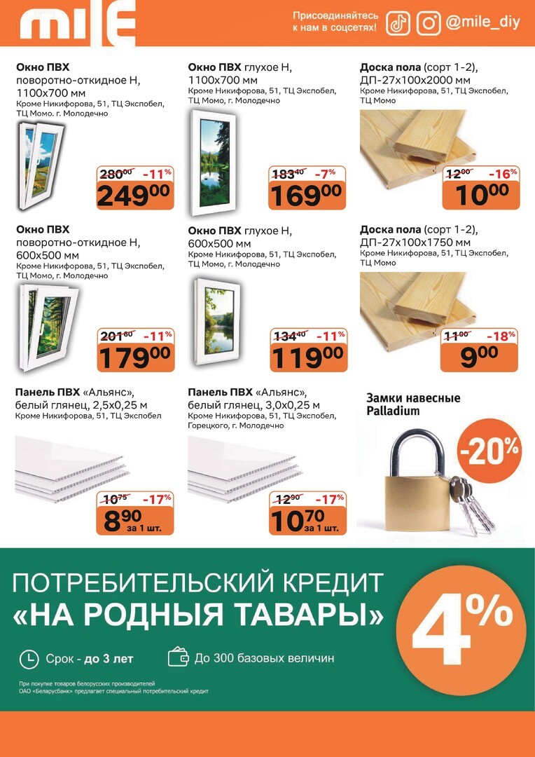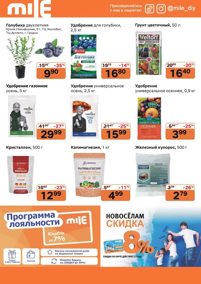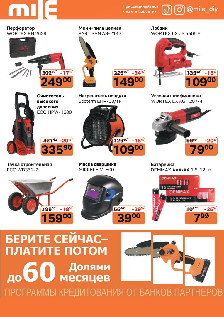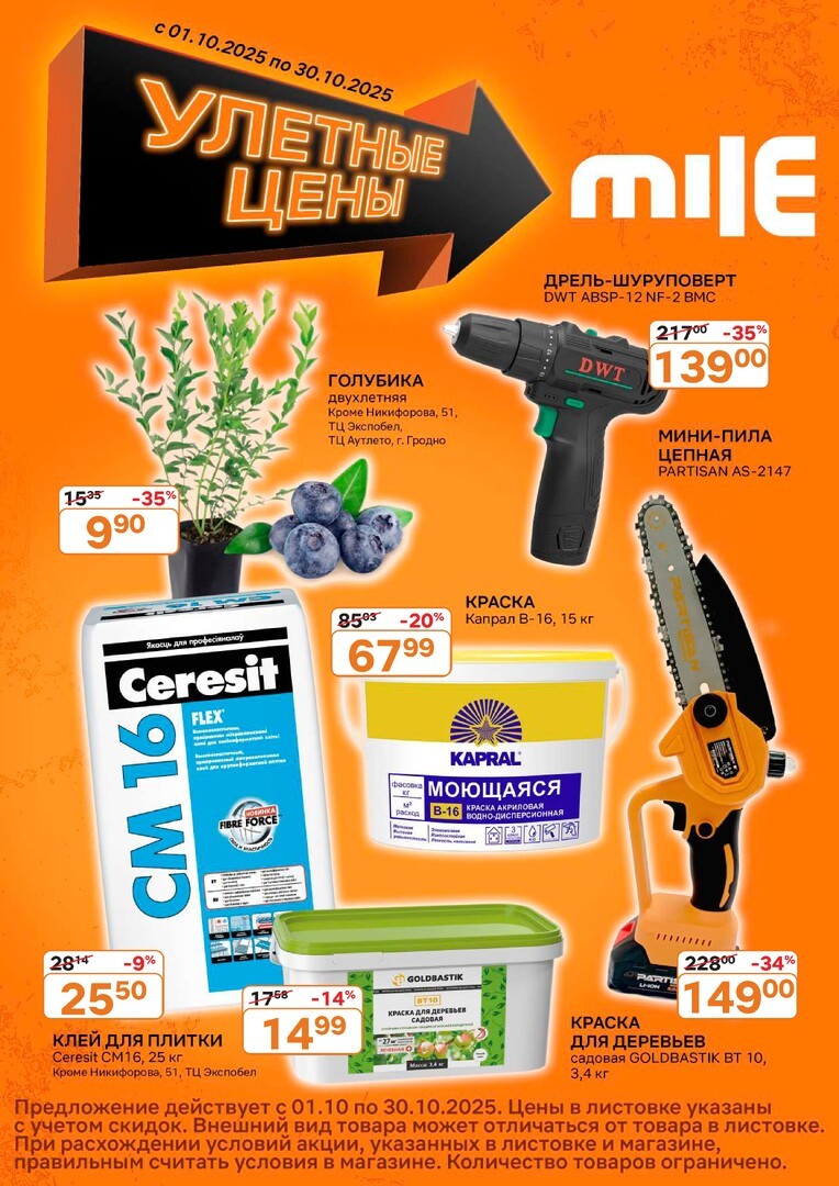 Mile — сеть строительных гипермаркетов в Минске, Бресте, Гродно, Молодечно и у ТРЦ Expobel, где легко выбрать всё для ремонта, дома и дачи по доступным ценам. Магазины открыты с 8:00 или 9:00 до 22:00, часто проводят акции и удобны для быстрых покупок.
