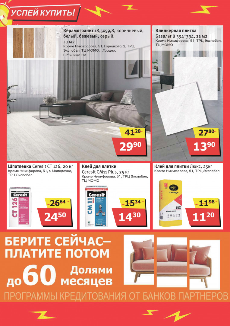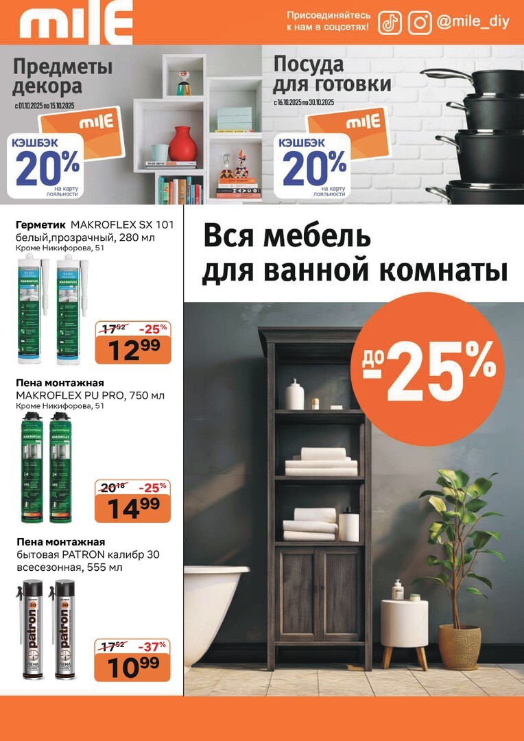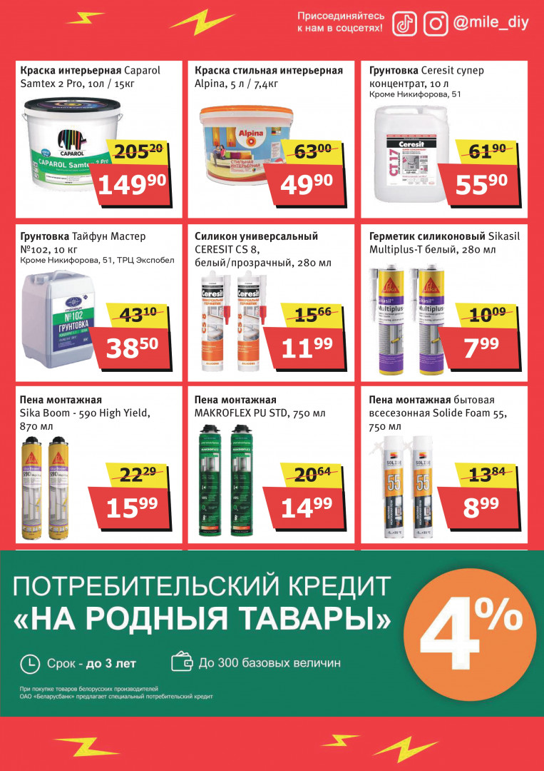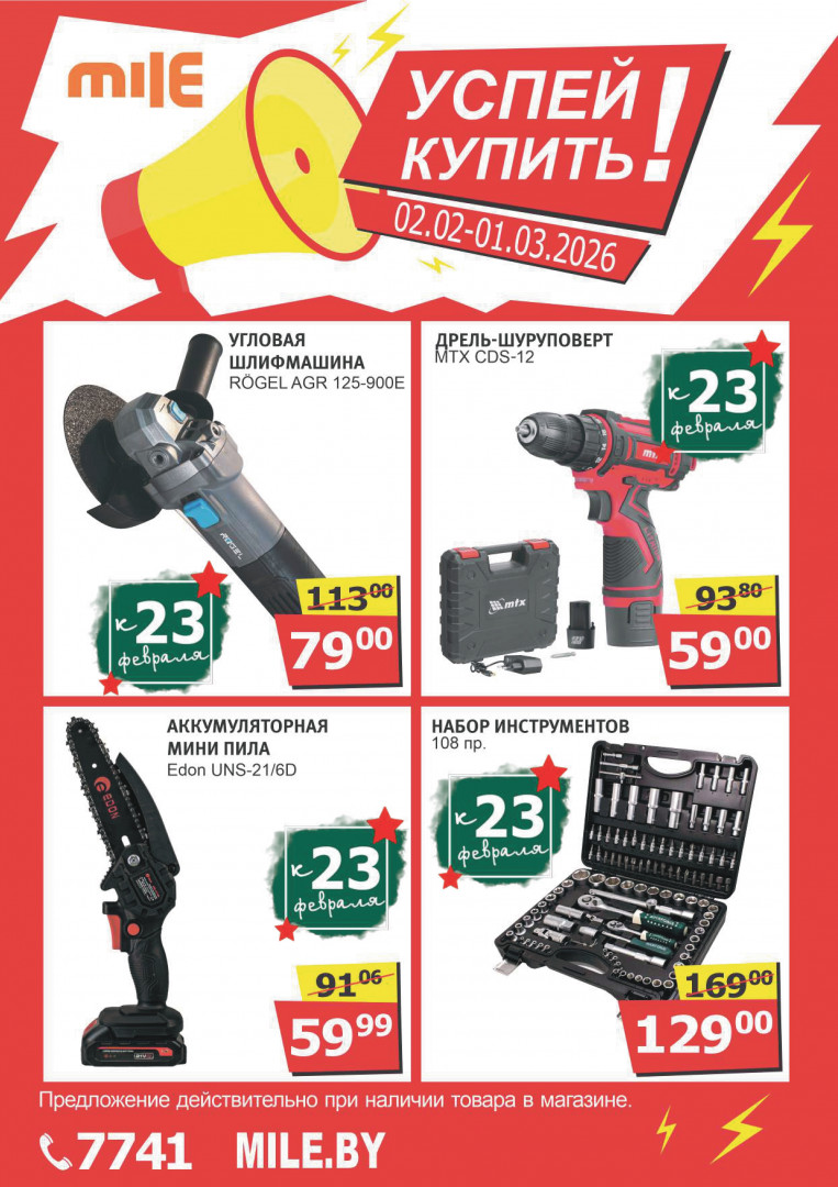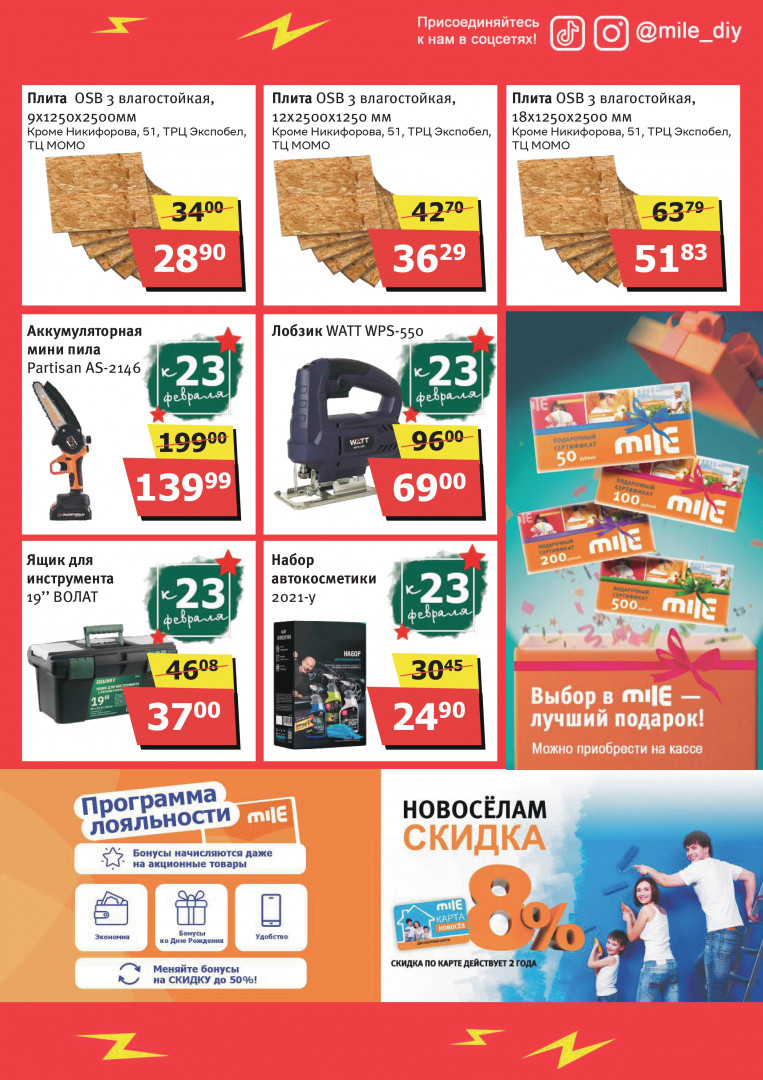 Mile — сеть строительных гипермаркетов в Минске, Бресте, Гродно, Молодечно и у ТРЦ Expobel, где легко выбрать всё для ремонта, дома и дачи по доступным ценам. Магазины открыты с 8:00 или 9:00 до 22:00, часто проводят акции и удобны для быстрых покупок.