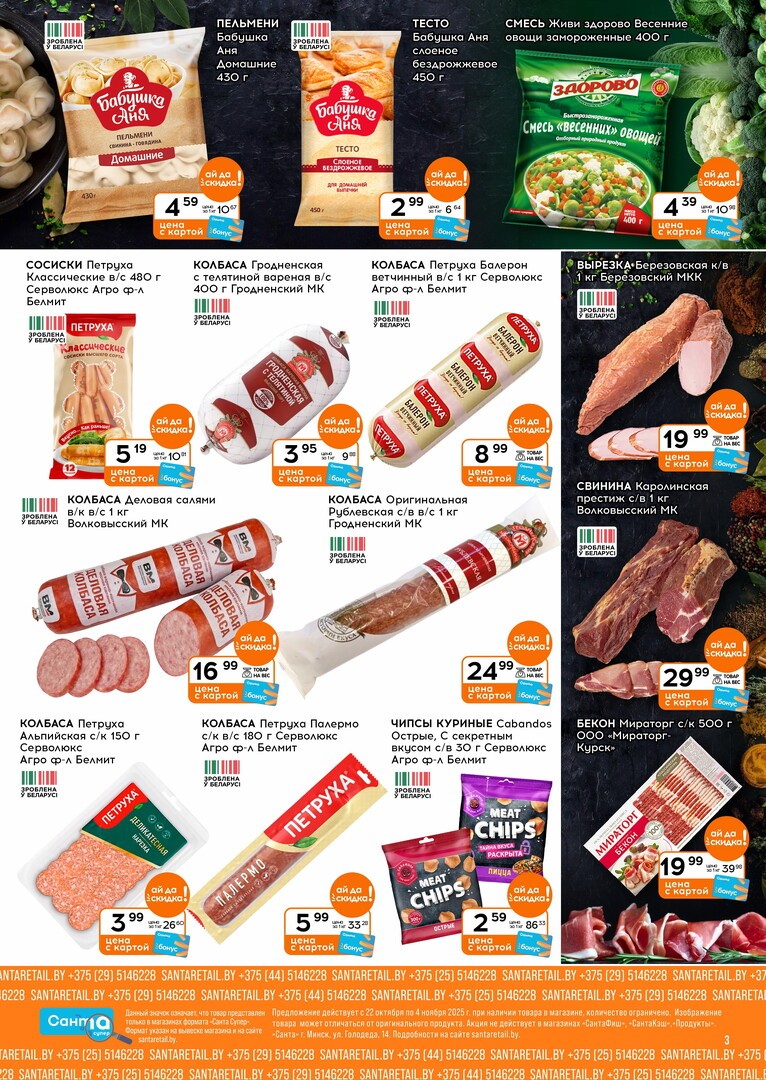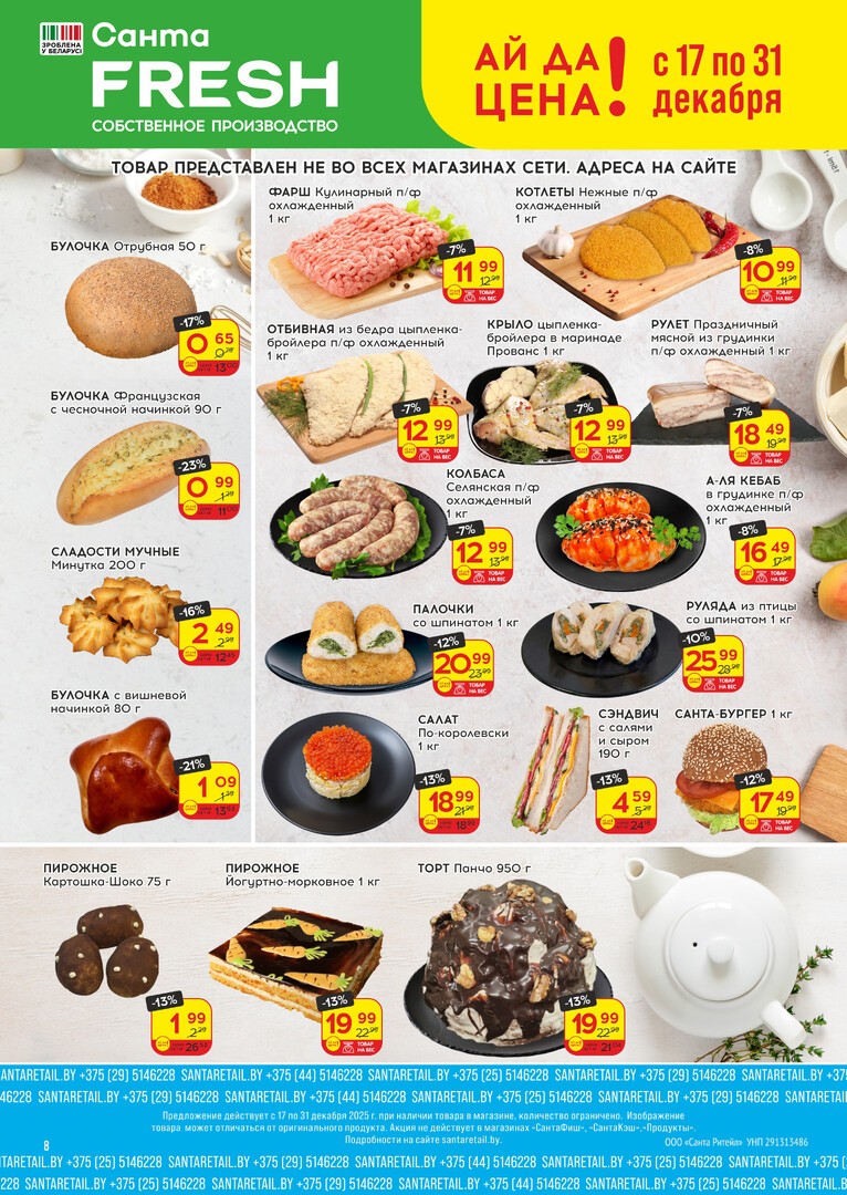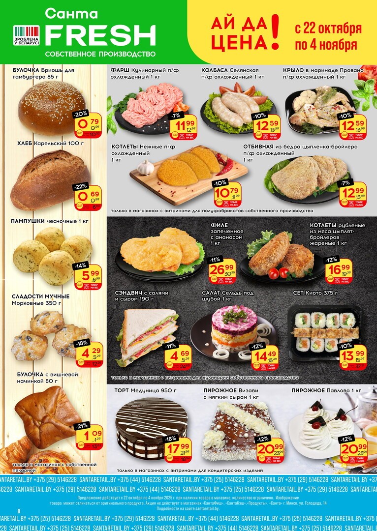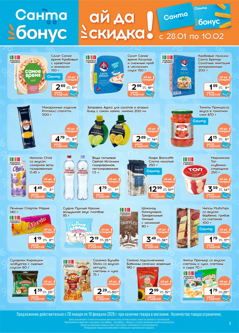 Скидки в магазине Санта распространяются на широкий ассортимент товаров. Вы можете выиграть в цене на продуктах питания, напитках, товарах для дома, детских товарах и многом другом. Особенно выгодно покупать по акциям: мясо, рыбу, молочные продукты и свежие овощи, которые составляют основу ежедневного рациона.
