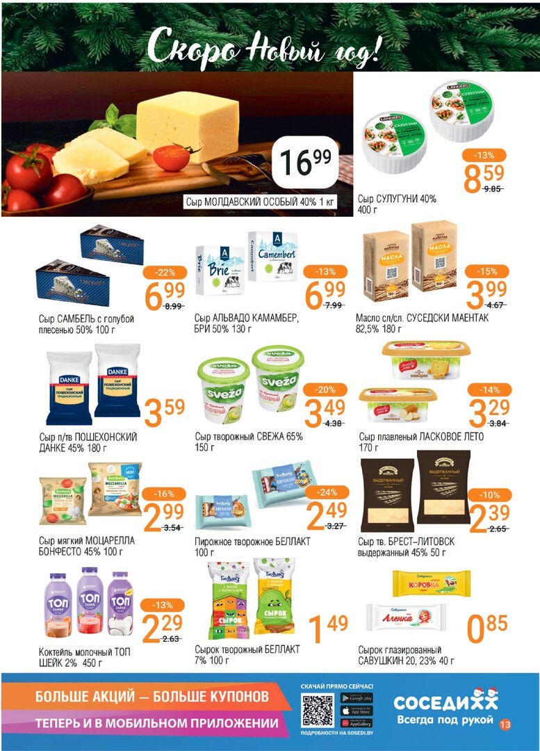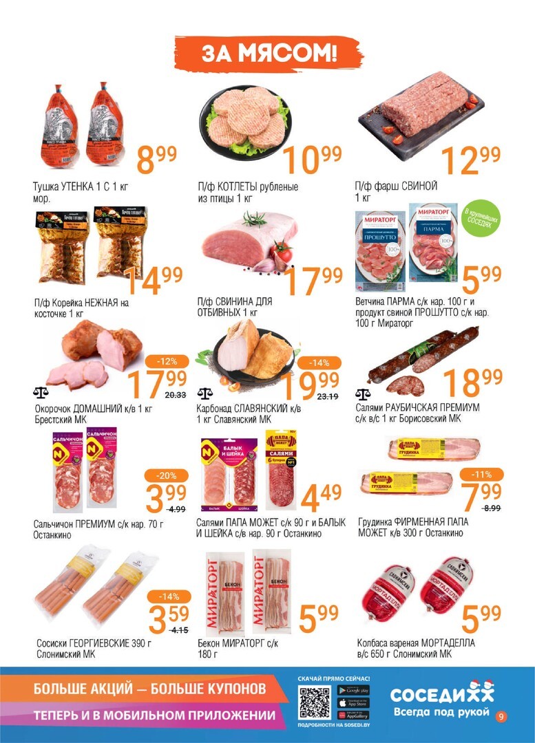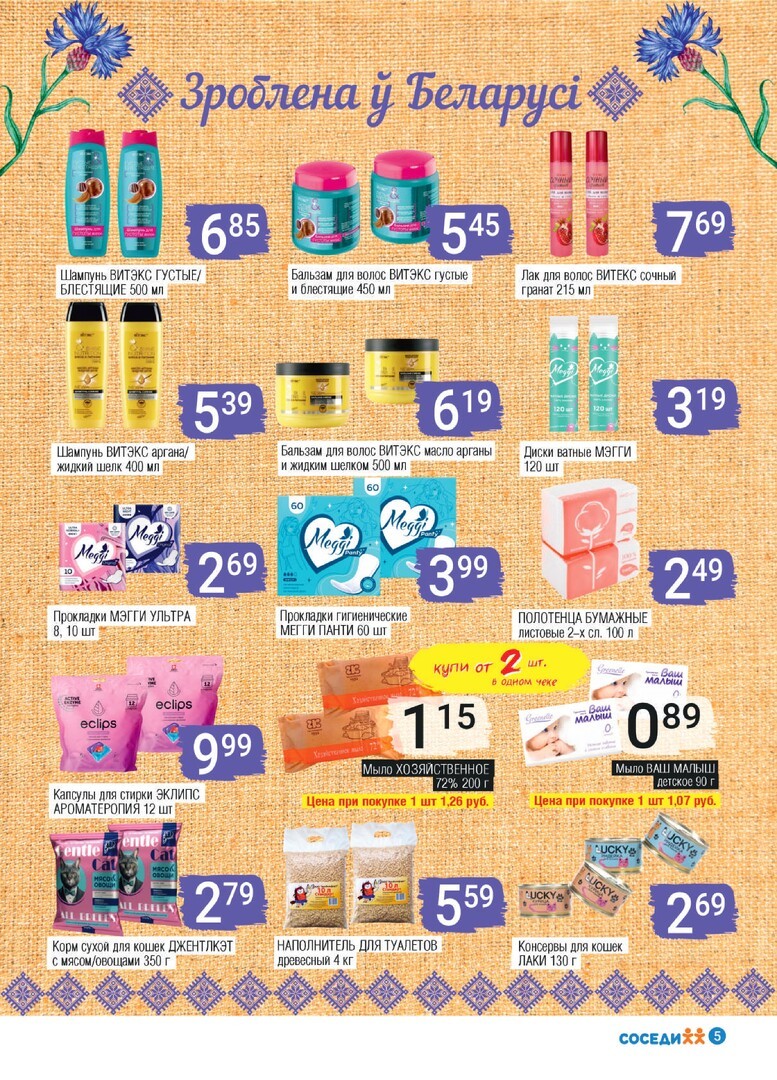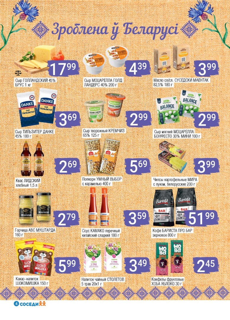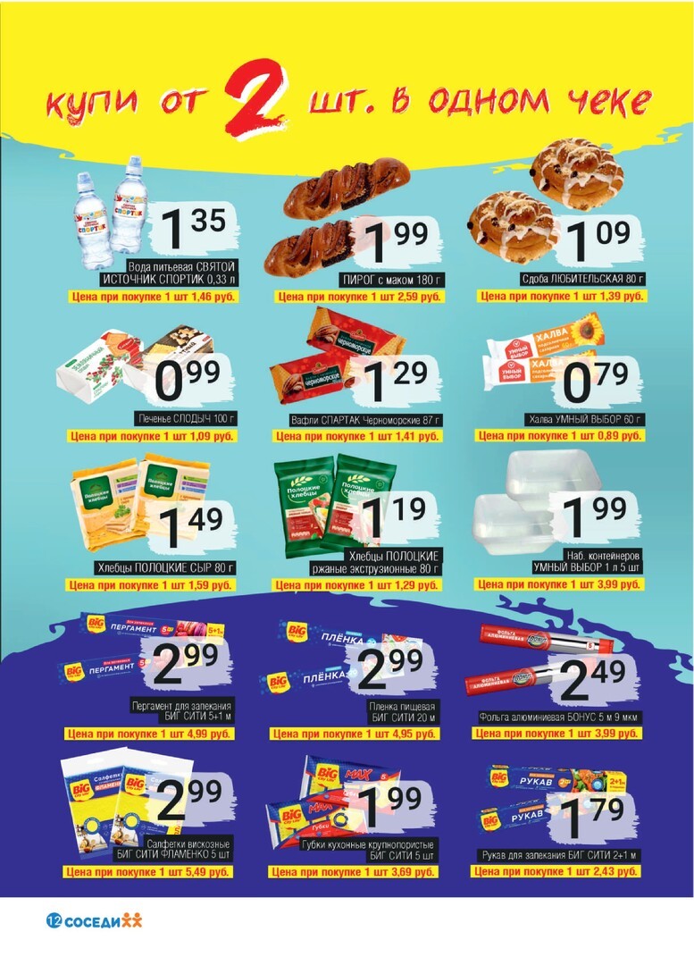 Супермаркет Соседи - это универсальное место для ежедневных покупок, где каждый найдет все необходимое от свежих овощей и фруктов до качественных мясных продуктов. В продаже разнообразие товаров, доступные цены и постоянное обновление ассортимента. Наш магазин славится дружелюбным сервисом и удобным расположением. Регулярные акции и скидки делают покупки еще более приятными. Посетите Соседи за выгодным шопингом. Для дополнительных экономий не забудьте проверить купоны и промокоды на сайте kupon.by.