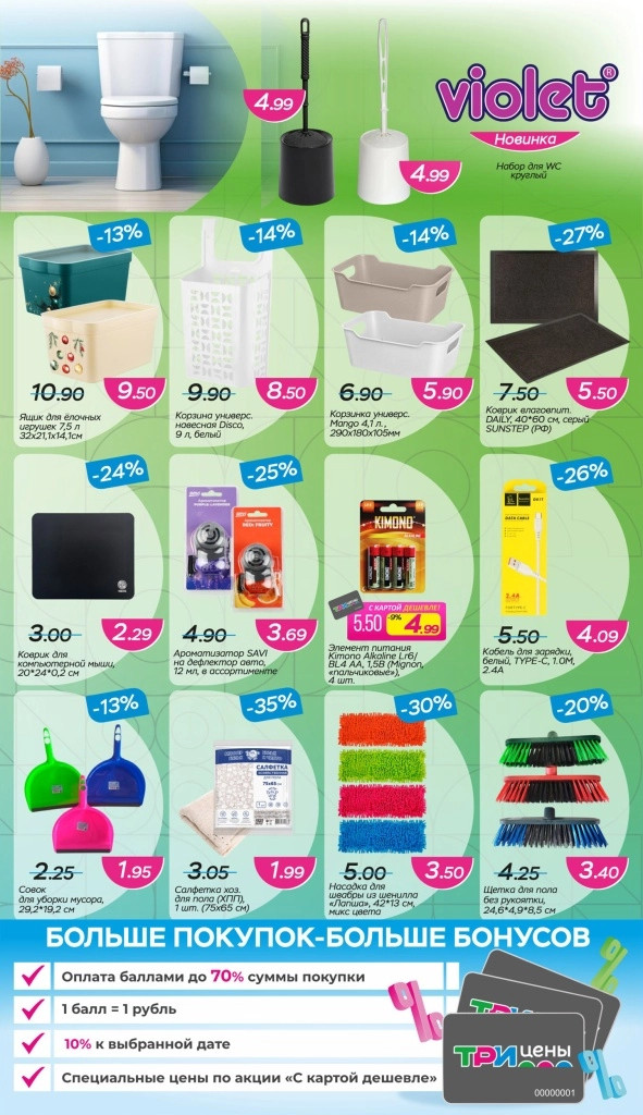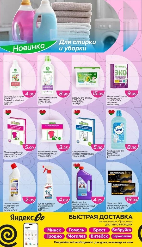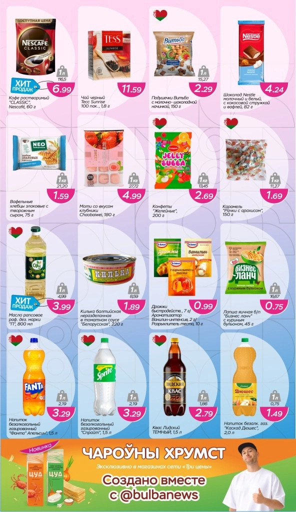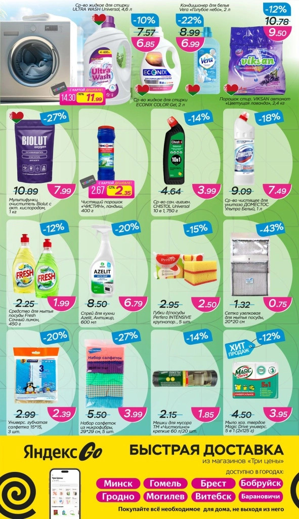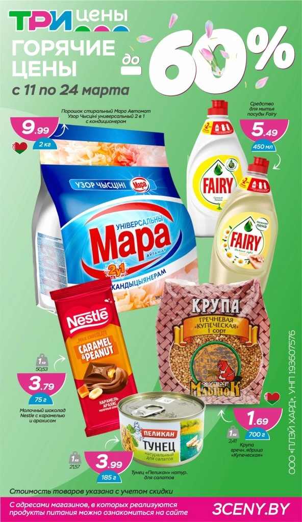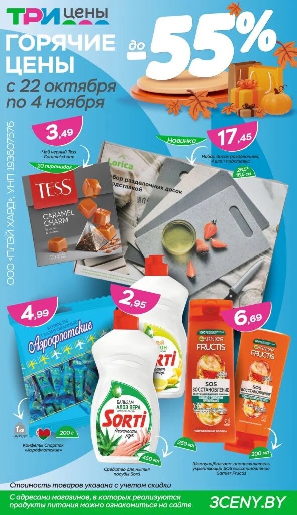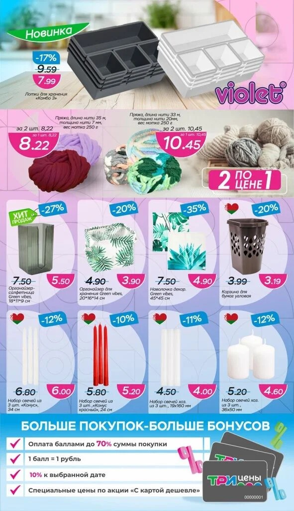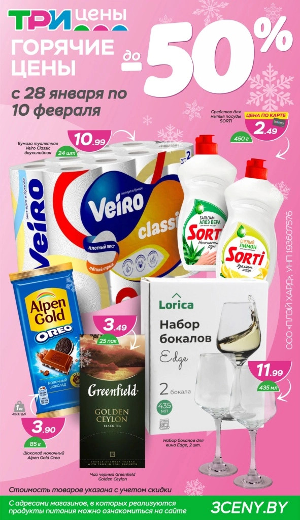 «Три цены» – сеть магазинов низких цен на территории Республики Беларуси. На полках магазина представлен широкий ассортимент товаров для дома и быта, косметика и парфюмерия, товары для строительства и ремонта, детские товары, большой выбор продуктов питания и многое другое.